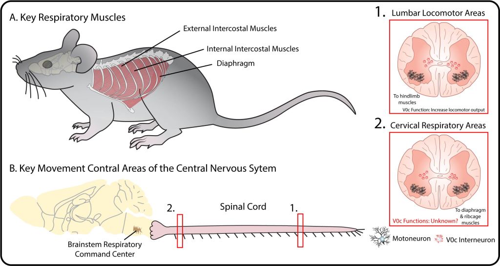 Under resting conditions, the inhalation of air into the lungs during the inspiratory phase of breathing, is exclusively driven by contraction of the diaphragm muscle, with exhalation of air during the expiratory phase produced by it’s passive relaxation. Remarkably, the respiratory system somehow knows how to predict metabolic needs that occur in response to movement. In anticipation for movement, breathing volume is increased – inspiration is facilitated through the recruitment of additional accessory respiratory muscles (external intercostals, abdominal, scapular elevator muscles). Further, expiration becomes active through the recruitment the internal intercostal and abdominal muscles. The mechanisms that underlie this feed-forward recruitment of respiratory muscles are not yet known. We think that local circuits in the cervical spinal cord might play a role in producing this activity-dependent recruitment of accessory respiratory muscles.